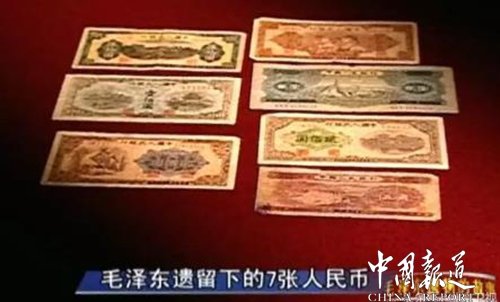 毛新宇说:“从爷爷去世以后,他老人家的全部遗产,包括生前用过的遗物,一律都由中央办公厅保管,不仅我的父母,李敏、李讷姑姑都没从爷爷那儿分到遗产,但是我们永远继承爷爷的这种伟大的精神遗产。”被传说得沸沸扬扬的毛泽东巨额稿费之谜,至此应该划上句号了,而毛泽东这个本可拥有巨额财富的人,在他去世后,所遗留的全部现金财产,只有工作人员找到的这7张建国初期发行的人民币,五张旧版,两张新版,合计不到今天的十块钱。