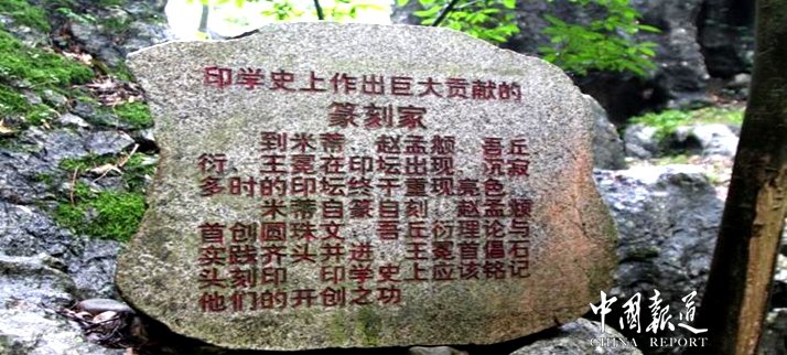 如今,像尹伯刚这样的农民版画作者,常宁市不下300人,常宁版画群体先后创作版画作品2100余件,获省美展和全国性美展奖的有110多件。常宁版画以"浓郁的乡土气息"享誉省内外,吴国威不知为此倾注了多少心血。萌生奇想造印山8年前的一天,吴国威突然萌生奇想:目前全国还没有人把印章艺术以摩崖石刻的形式大规模地在大自然中表现,如果把中国几千年的篆刻精品刻于山水之间,在美景中展现艺术,让印章与奇石交融,促进文化、旅游共同发展,岂不两全其美?他又想到了常宁市庙前镇金龙村那"养在深闺无人识"的石头山。那不是建印山最好的地方吗?无意中的"吻合",令他激动不已。