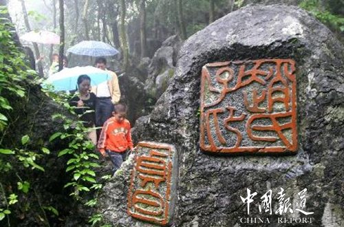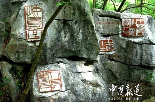 如今,像尹伯刚这样的农民版画作者,常宁市不下300人,常宁版画群体先后创作版画作品2100余件,获省美展和全国性美展奖的有110多件。常宁版画以"浓郁的乡土气息"享誉省内外,吴国威不知为此倾注了多少心血。萌生奇想造印山8年前的一天,吴国威突然萌生奇想:目前全国还没有人把印章艺术以摩崖石刻的形式大规模地在大自然中表现,如果把中国几千年的篆刻精品刻于山水之间,在美景中展现艺术,让印章与奇石交融,促进文化、旅游共同发展,岂不两全其美?他又想到了常宁市庙前镇金龙村那"养在深闺无人识"的石头山。那不是建印山最好的地方吗?无意中的"吻合",令他激动不已。