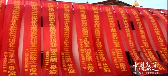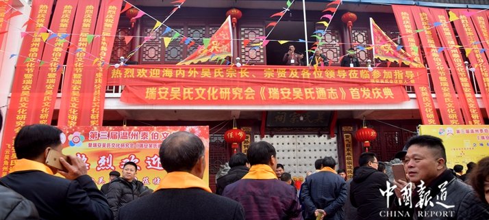 中国报道讯(记者吴蜀丰)冬日的阳光呈现一派祥和的温馨,人山人海的吴家人伴随锣鼓喧天的喜气氛围,中埠吴氏宗祠彰显热闹非繁的浓郁景象。第三届温州泰伯文化节暨瑞安吴氏文化研究会《瑞安吴氏通志》首发庆典今日(2018年1月13日)在浙江瑞安市东山街道中埠吴氏宗祠成功举行。