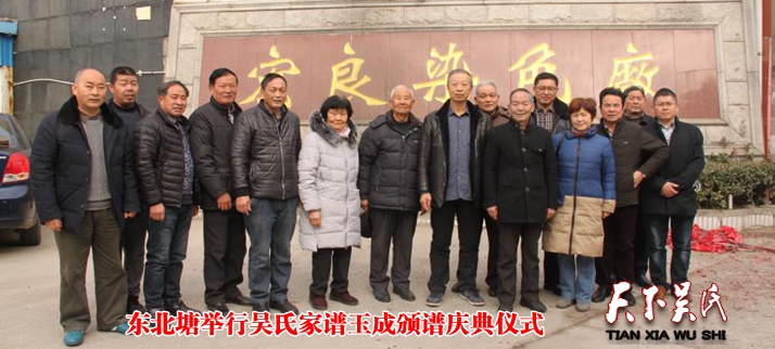 天下吴氏讯(特约采编吴建东 )中国素有“盛世续修家谱”的文化传统,近年来续修家谱寻根认亲悄然兴起。冬日的阳光和煦而温暖,各位脸上都洋溢着喜悦之情。   2018年1月14日,由泰伯吴氏祖地宗亲联谊总会秘书长吴仁德、副秘书长吴宪晔、顾问吴士德、常州吴氏宗亲会常务副会长吴锡金、副会长吴振达、秘书长吴纳新,无锡吴氏祖地宗亲会办公室主任吴仁兴、宗长吴建兴、吴建文、宗姐吴凤英、吴胜英以及东北塘吴洪良宗长等宗亲在无锡宏良染色厂举行了东北塘支吴氏家谱玉成颁谱庆典仪式。这里要特别感谢热心于宗亲事业的吴宏洪良宗长,在这次续修家谱玉成中,慷慨解囊赞助人民币5万元。