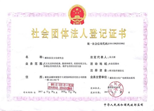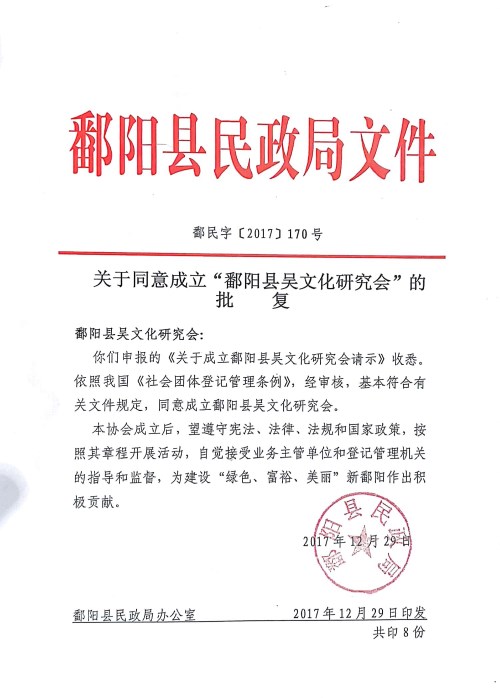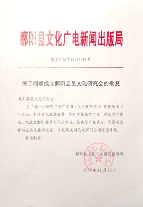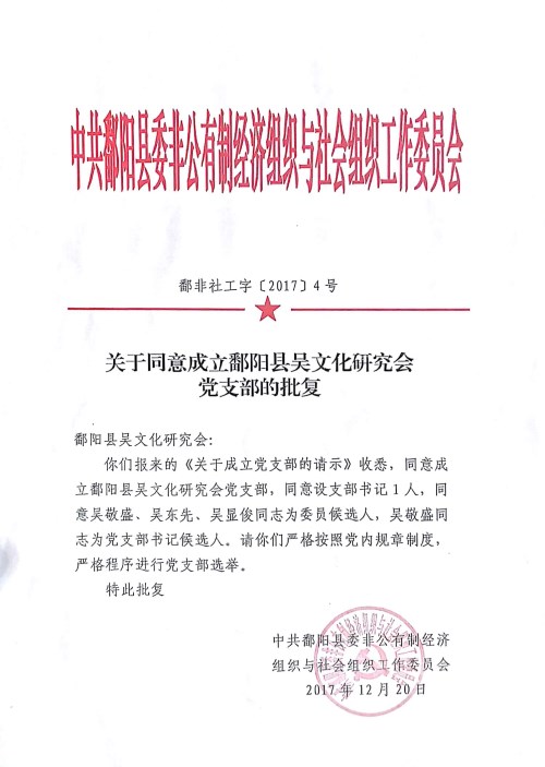 在鄱阳县吴文化研究会会长吴立新、吴敬盛、吴东先、吴显俊等宗亲的努力下,于 2017年12月20日,中共鄱阳县委非公有制经济、组织与社会组织工作委员会批复同意鄱阳县吴文化研究会成立鄱阳县吴文化研究会党支部,同意设支部书记1人,同意吴敬盛、吴东先、吴显俊同志为委员候选人,吴敬盛同志为党支部书记候选人。