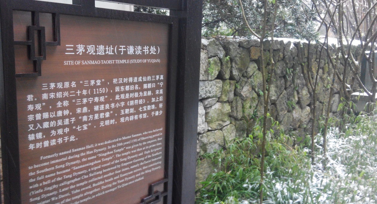 离开城隍阁,继续向山里面走,沿途欣赏路边的高大的古树,雪中盛开的鲜花,以及雪景。在经过三茅观旧址时,看到旁边的牌子上介绍这是于谦读书处。这位于谦不是郭德纲的搭档、相声学员于谦,而是明朝的兵部尚书。
