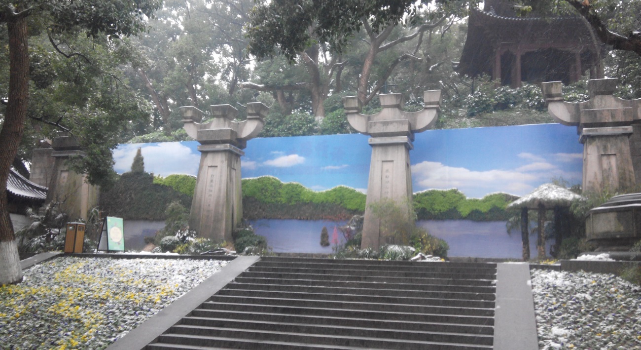 到了吴山,看到吴山广场因为要修建吴山广场地铁站,而被围起来了,正在破土施工,于是就去山下的杭州博物馆参观一下,之后沿山道而上,来到城隍阁。城隍阁很高大,旁边是吴山天风的碑亭,“吴山天风”这四个字是浙江湖州的书法家费新我在八十二岁时用左手写的。由于上山时雪下得正大,所以在城隍阁之上,向四周看,能见度不高,看不到西湖,只看到绿色的山峦和没有摩天大楼的街区的屋顶上覆有白雪。由于下雪,城隍阁上的游人不多,不过在我刚离开城隍阁时,来了一群日本游客,说着日语,上了城隍阁。