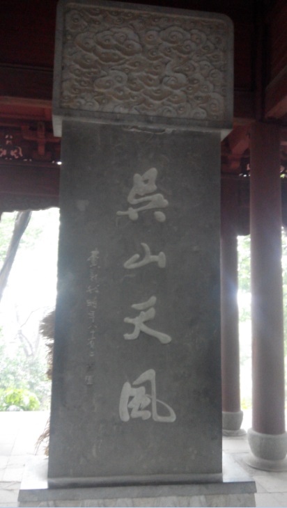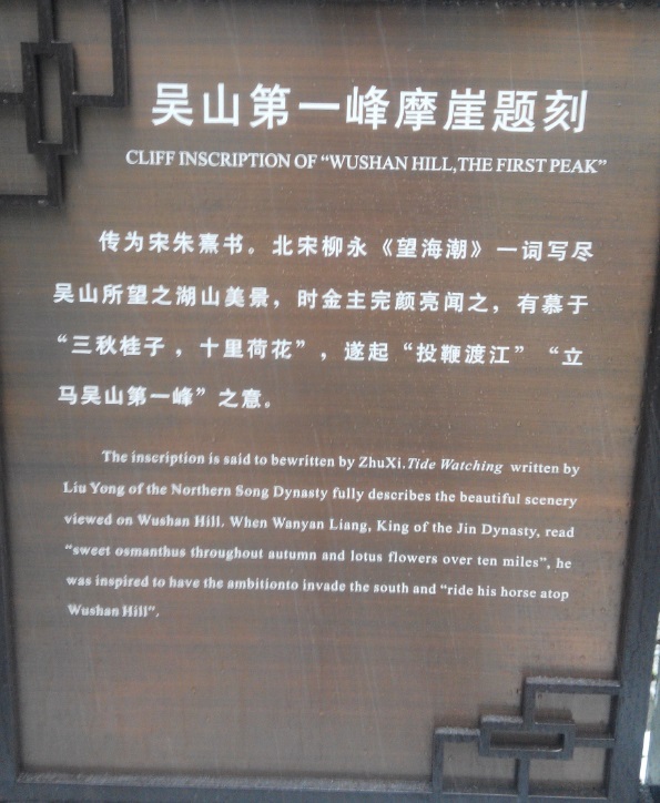 在三茅观旧址不远处,是“吴山第一峰”的摩岩石刻,吴山之中,山石很多,所以自古留下的石刻也多,据介绍,“吴山第一峰”这五个字,是朱熹所书。北宋时期福建崇安著名词人柳永写下《望海潮》: 东南形胜,三吴都会。三秋桂子,十里荷花。这首词在一百年后,引发了金国第四任皇帝完颜亮写出了“提兵百万西湖上,立马吴山第一峰”的诗句,比完颜亮小八岁的朱熹,却因此而提笔写下了“吴山第一峰”五个字,留到了现在。