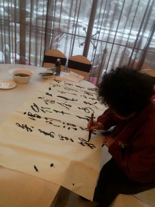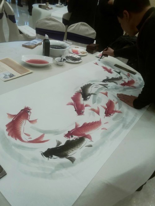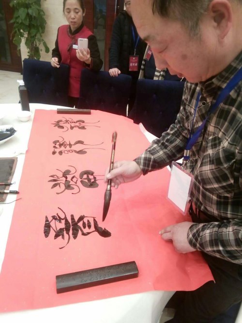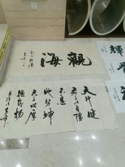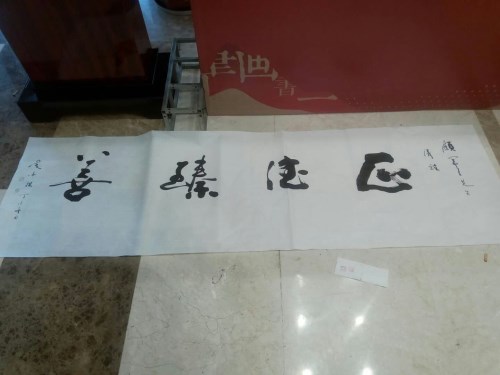 在中华清风书画协会江阴分会挂牌仪式结束后,艺术家们即兴挥毫,留下纪念作品。吴卫祖先生写下"清风徐来,百花盛开"和"正德臻善"两个六尺对半横幅。
