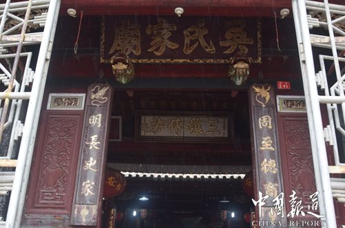 还有民国时期的灵水旧街,仿佛为我们诉说着灵水社区曾作为交通要道在历史上有过的繁荣……灵水吴氏家庙始建于明嘉靖四十年(1561),历明、清至民国元年,祠堂几经重修,1986年海内外族人又鸠资按原貌进行重修。祠堂坐西北,面东南,傍依灵源山,遥望石井江。门前有三级台地依次筑埕,视野开阔。一对旗杆竖立在第三级埕前。虽然祠堂是三开间建筑,却有气势:台基甚高,门前列五级台阶。大门挂木联:“周至德裔,明长史家。”门簪刻为龙首突出,托着红漆万字花纹为底的匾额,上书金字“吴氏家庙”。祖宗龛前,梁枋之间挂满“大理寺卿”、 “三朝御史”、“太傅尚书”、“监察御史”、“四代一品”、“粤海金汤” 之类金字匾。厅梁中还悬挂着一副吴氏始祖季札的绸缎绣像,并绣有对联:“志异征诛三让两家天下,功同开闢一杯万古江南。”横批是“世家第一”。