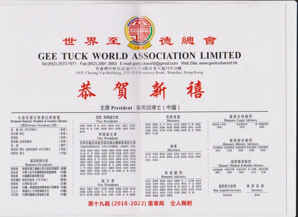 春回大地,万象更新。在二0一八年新春佳节到来之际,我谨代表世界至德总会第十九届董事局全体同仁,向全球五大洲的至德宗亲及其家人拜年。恭祝你们新年快乐!在新的一年里,身体健康、家庭幸福、工作顺利、万事如意、兴旺发达!