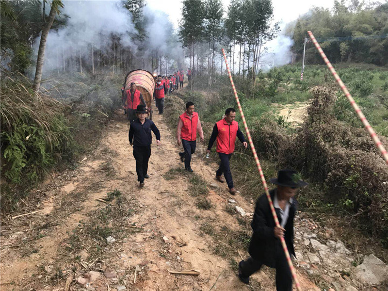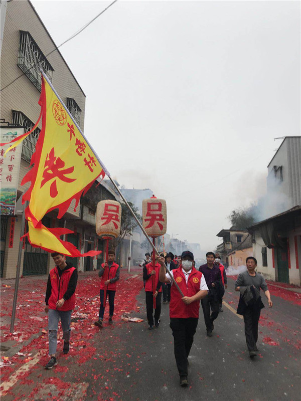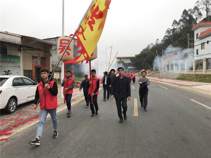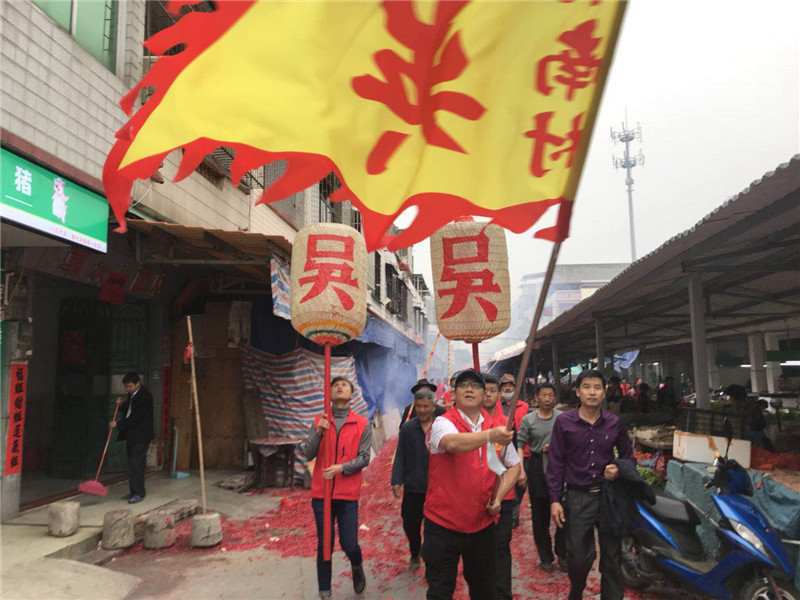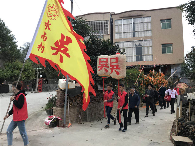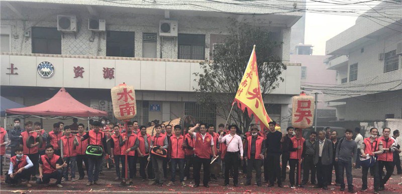 2018年2月21日(农历正月初六)早上七点,广东惠州市博罗县湖镇镇水南村吴家族人又迎来了一年一度的买灯节。湖镇镇水南村吴家队伍扛着吴家大旗、穿着整齐的服装、打着锣鼓,步行三公里远的路行进到吴家宗祠。