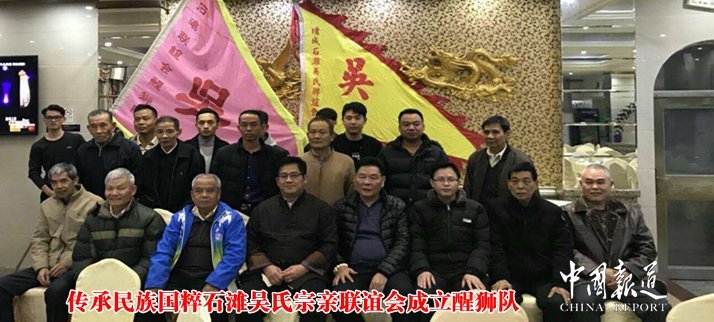 中国报道讯(记者吴蜀丰 特约采编吴昌禄)为了更好传承中华民族国粹文化,弘扬民族优秀文化精神,2017年2月22日(农历正月初七),在广东珠三角吴氏宗亲总会执行会长、增城区石滩吴氏宗亲联谊会会长吴萧麟等宗亲的倡议和组织下,广州市增城石滩吴氏宗亲联谊会醒狮队在增城区石滩镇海景酒楼正式成立。