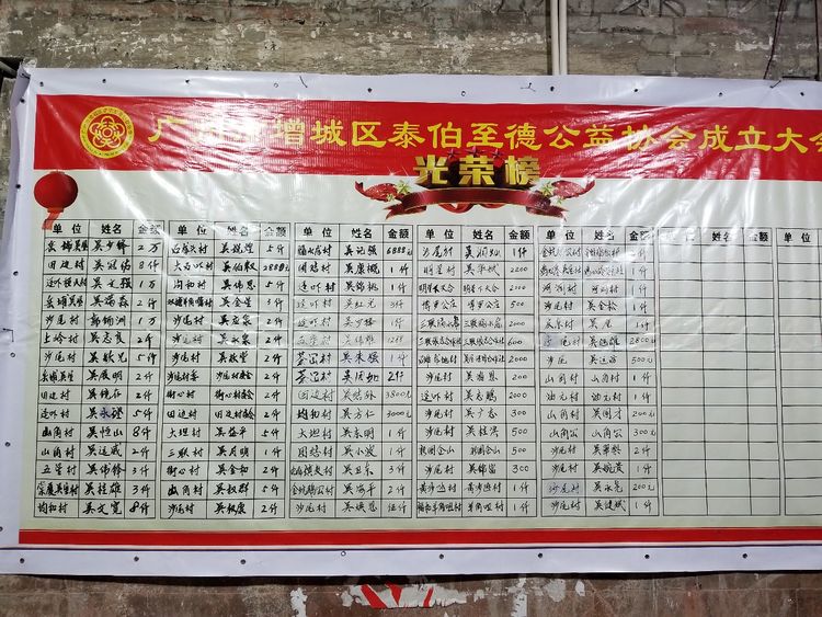 2018年1月23日,广州市增城区泰伯至德公益协会筹备小组召开大会,增城区四十二个吴氏聚居村庄的理事、监事和代表共70多人参加大会,会议一致通过了广州市增城区泰伯至德公益协会的章程,并选举了协会第一届领导层成员。