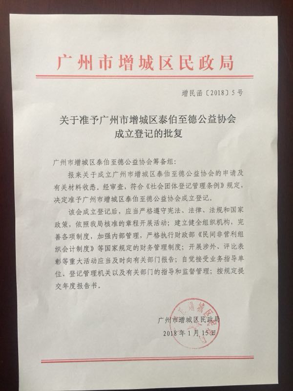 2018年1月15日,广州市增城区泰伯至德公益协会获得广州市增城区民政局批准成立。