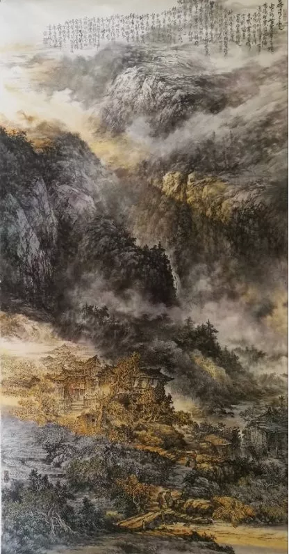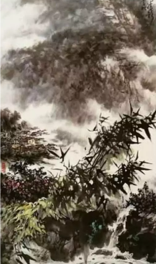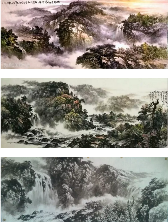 纵观吴辉忠的作品,气韵生动,神形涌溢。无论着墨、敷彩、落笔用线、点染积皴,都把墨韵肌理、笔触,发挥得淋漓精致,被他自称为“拖墨带水”、“见笔云”的表现手法尤为独特,直逼传统山石皴擦的技法。他的山水画大而不空、有势有质,即有开阔视野,近观质朴。大气势、大笔墨,又不遗余力把握细节。远观则山峦厚实、云雾飘逸,近看则树木苍郁、草苔青翠;远有气势、近具质味。个性十足,内涵丰富、运笔得心应手,静溢虚渺,能入“神驰清幽之地”。