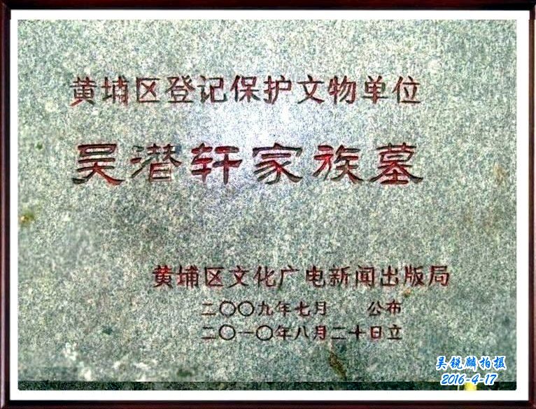 笔者注:在吴潜轩墓前立着一块石板上,刻凿着《吴潜轩家族墓》,由黄埔区登记保护文物单位黄埔区文化广电新闻出版局,2009年公布,2010年8月20日立》(图5)。