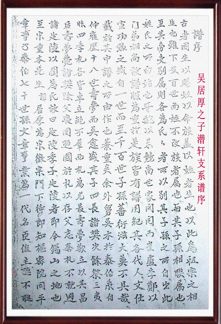 在2012年5月份,老吴借给我阅读,获益深矣,并即时用数码相机拍照收藏。现经他的同意,把《吴居厚之子潜轩支谱序(黄泽谱序)》(图1和图2)照片公开报导,以郎飨读者。