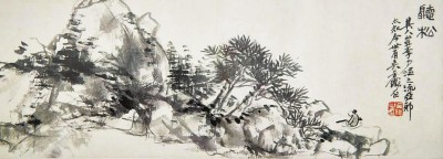 山水卷装池于翌年,后载二十七家之二十八则题记。前二十二则为缶庐师友辈,先后为杨岘 (二则)、万钊、费念慈、周星诒、高邕、凌霞、金尔珍、沈公周、章钰、金尔珍、沈曾植、马一浮、郑孝胥、朱士林、王国维、陈三立、冯幵等二十一家。缶庐殁,其子东迈又延请诸宗元、冒广生、夏敬观、沈剑知、吴湖帆五家题记。后又有藏家属笔者题跋一则,总计二十八则。吴氏将此山水卷装池后,至其下世前三十四年里,多次携卷外出求题,若非自创之妙品,岂能珍重如此。况其时吴昌硕与王一亭尚无交际据考吴、王相识当在1909年3月,即在绘成此卷之十七年后,不存在由王一亭代笔可能。书法家、金石家杨岘在题跋中称:“昌硕仁弟自画山水八纸,装治成卷。癸巳 (1893)秋七月下榻敝斋,出视率题。”高邕的题跋更指出此卷是作于其画室,跋称:“缶庐金石家,五十学山水。昨在李盦中,一挥得八纸。天生横行笔,今古皆不是。闯入大滌堂,吓得石涛死。”又谓:“苍公今年忽画山水,此卷不学石涛而有石涛韵度,展玩数过,乃知此老胸中未易窥测。癸巳十月,高邕题于上海。”证据凿凿,可知吴氏是工于山水的,且具有不凡的水准。附带指出,国内有两家博物馆藏有双胞胎的“听松图”。曾有此是彼非的争辩,而以拙文所刊出之 《听松图》(见刊头图) 及其款题考鉴,可知“双胞胎”者,两无一真,皆为依样仿造的赝品。