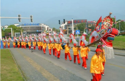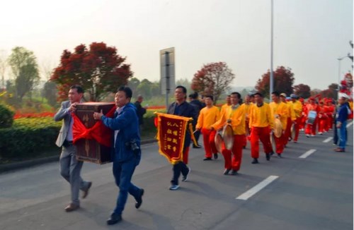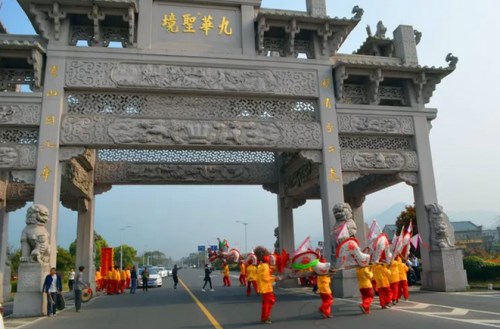 4月1日下午三时许,100余人组成的龙灯、锣鼓、堂旗等队伍,在九华山老田吴氏总会吴海祥的带领下,浩浩荡荡来到大九华山”九华圣境“大牌坊下迎接南京浦吴氏宗亲。