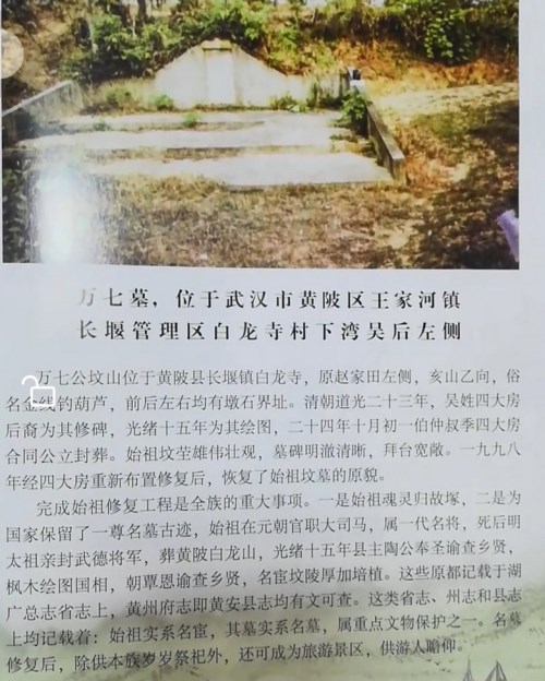 中午11时许,再转黄陂王家河镇长堰区白龙寺村始迁祖武德将军万七公墓地祭拜。因万七始祖墓年久失修,各房宗亲负责人就修缮万七公祖陵召开会议,会议由黄陂白龙寺村支书吴华明主持,宗亲代表踊跃建言献策,大家一致推选祖墓所在地华明书记任修墓总指挥,并成立组织(修墓专班),各房负责人积极配合支持,要求在一个月内尽快做好修墓的前期各项筹备和设计规划工作,目前通往墓地的路基和墓地广场已平整。