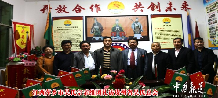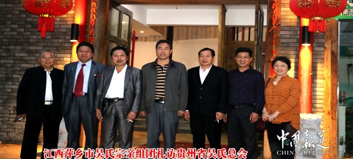 中国报道讯((特约采编 吴忠致 吴天友 ) 4月3日,贵阳的天气就像诗句中:春雨丝丝,愁肠百转,杨柳摇拽,春风轻拂。天阴沉沉的,淅淅沥沥的小雨,如丝如般飘落在大地上,整个大地都笼罩在“春”的海洋里。江西省萍乡市吴氏宗亲吴兆萍董事长率华吴副主席,吴东萍副会长及夫人,江西泰伯庙筹建组委会吴建纯福总指挥和吴展声理事等一同前来贵州贵阳,对贵州省吴氏宗亲总会进行拜访慰问,在爱的海洋里建起友谊的桥梁。贵州省吴氏宗亲总会会长吴学强,副会长吴天友等领导同志对江西慰问团的到来表示热烈的欢迎,并致欢迎词。