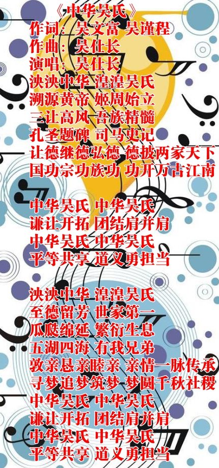 ◎吴氏歌曲代代传,歌唱吴氏代代兴 --吴忠致 (贵州)◎吴氏之精英,吴氏之福,吴氏之骄傲,大赞!--吴天睿 (四川)◎作曲好,唱得好,吴家才子威武 中华吴氏,流芳万世 --中国太平吴春华
