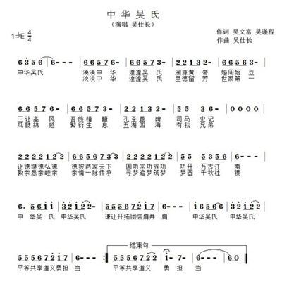 ◎歌词全面,内涵丰富,唱起来很有气场,声音宏亮。好歌!一首歌是一个故事,一首歌是一首诗,一首歌是时代的主旋律,一首歌是文明进步的正能量,《中华吴氏》这首歌以欢快明朗﹑激情的节奏,唱出吴家人的心声,也是对中国吴文化的精典概括,将激励吴氏家人奋发向上!精诚团结!勇往直前!词曲创作演唱为清一色的吴家人,更加彰显吴氏后裔名人辈出,青史辉煌,吴氏文化,开拓进取精神!——吴蜀丰(天下吴氏网总编辑)。