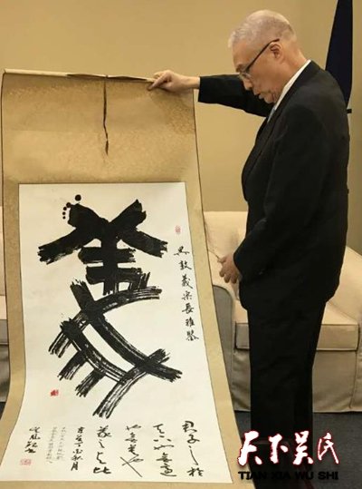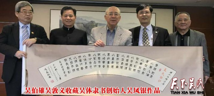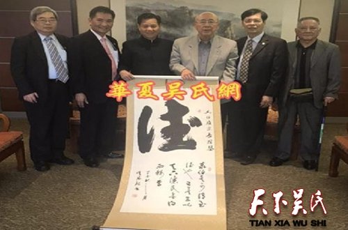 天下吴氏讯(吴蜀丰特约撰稿海韵) 原标题《吴伯雄宗长 吴敦义宗长 收藏吴凤银吴体隶书》2018年3月28日上午,原世界吴氏宗亲总会二届主席吴良民、厦门市吴文化研究会会长吴国荣博士、台湾桃园吴姓宗亲会顾问吴国祯、东莞吴氏宗亲会荣誉会长吴铭煜、厦门吴氏宗亲会顾问吴燿旭,拜访中国国民党荣誉主席吴伯雄。拜访中,吴良民向吴伯雄宗长赠送了由中国黑龙江吴风银(又名吴凤银)创立的吴体隶书书法作品以及吴凤银的行草作品“德”。
