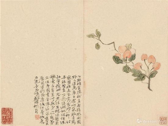 杨法(1696—约1762后),南京人,诗书画印兼擅。他传世画作极少,扬州博物馆藏其两片册页,一写月季,一作绣球,设色小写意,在“勾花点叶”派基础上略有变化。故宫博物院藏其墨花册,笔墨简放,略类青藤,署款“丙子”为乾隆二十一年,其年六十一。