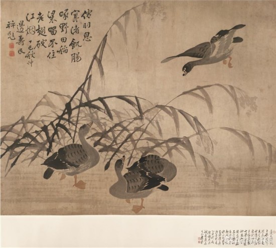 边寿民(1684—1752)“曲江十子”之一,诗文书画无不擅。居淮安“苇间书屋”,别号苇间主人或苇间居士,可见他对于苇非常喜爱。因芦苇而自然延伸到大雁,芦雁便成了他的艺术代表,当时人以“边雁”称之。