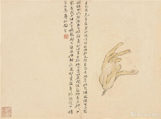 陈撰(1678—1758)浙江人人,早年受业于毛奇龄,诗文书画俱工,又精于碑版古籍之鉴定。中岁流寓扬州。他为人清高,不轻易为人作画,故有“每纸落人间,珍若拱璧”之谓。传世作品不多,且大都为册页小品。萧平老师认为,陈撰是“八怪”中画笔最为简略的一人,往往仅在纸素一角作画,留其大部空白,属于纯粹的文人墨戏。