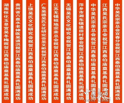 中国报道(吴蜀丰江西报道相约江西萍乡为泰伯庙奠基“添砖加瓦”的邀请函发岀以来至今,受到全国各地吴氏宗亲及海外宗亲的关注,我们在此表示衷心感谢并真诚期待你的光临!现将4月26日(农历三月十一日)参加的祝贺部分单位公示如下(排名不分先后);名单更新中。