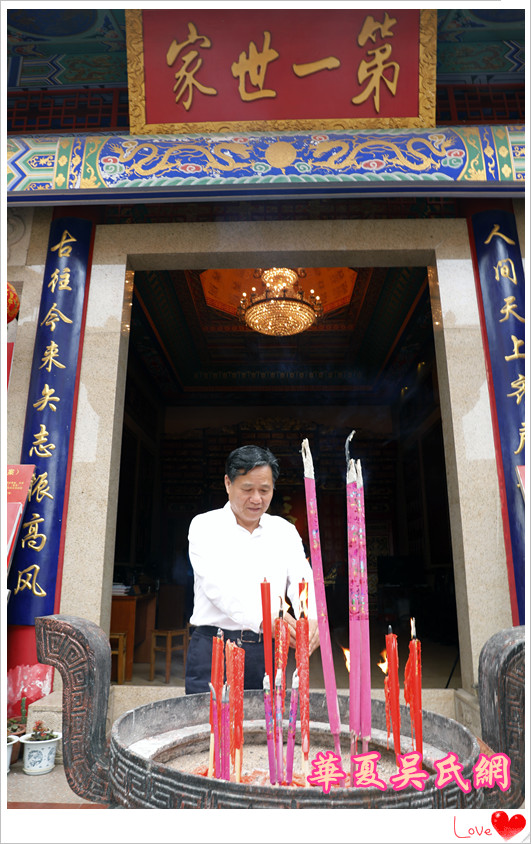 吴氏宗祠位于和谐城的第一排重要位置,充分体现出第一世家的荣耀与份量。吴国荣宗长在祭拜后,对吴氏宗祠的内外装修、文化内涵给予了高度评价。他说,单纯就建筑体量而言,吴氏宗祠在全国来讲,规模并不大,但从整个百家祠堂来看,其恢弘庄严的气势、典雅明亮的室内装潢、深厚悠远的文化底蕴与宗祠特色,在这里就表现得十分突出。这是我看过全国各地吴氏宗祠中,印象最深刻的宗祠。国荣会长在给泰伯先祖上香后,慷慨地给宗祠捐了5000元香火钱。