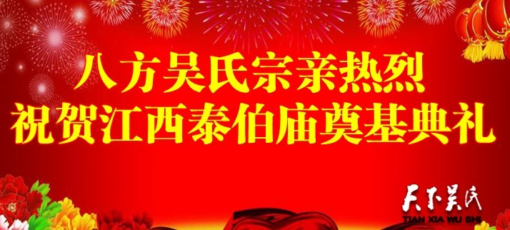 欣闻江西萍乡吴氏,兴建先祖泰伯公之庙堂,令人喜出望外,欣喜若狂,可喜可贺!乃吴氏之幸事,吴氏后裔,枝繁叶茂,遍布全球,家风传承,发扬光大,至德精神,代代相传,中华吴氏,谦让开拓,团结肩并肩,平等共享,道义勇担当。再次祝贺江西泰伯庙奠基典礼圆满成功!