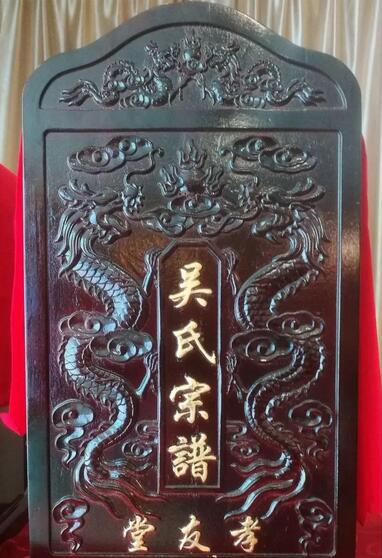 新修的谱书装在木质盒子里。盒子正面雕刻着祥云和两条龙,还刻有“吴氏宗谱“、“孝友堂“金色大字。盒子上面披盖着红绸布。显得庄重、大气、典雅。每位请谱者,先向三圣公像三鞠躬,再像谱书三鞠躬,然后将装着谱书的木盒子双手捧着下去。