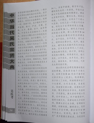 《大典》系吴氏家族史籍。收录范围不受旧的传统观念束缚,既收录吴氏中省军级以上高官名将,又收录造福一方的地方科局级及相当此级职称(均含副职)以上的中层人士;既收录吴氏中名闻遐迩的教授、专家、学者、高级文化科研人员和国营与民营企业家,又收录对国家、社会有一定贡献的族彦乡贤,同为一个目的:彰表贤士,激励后人。
