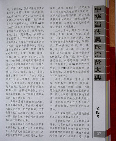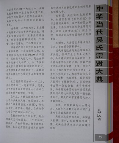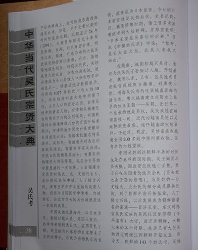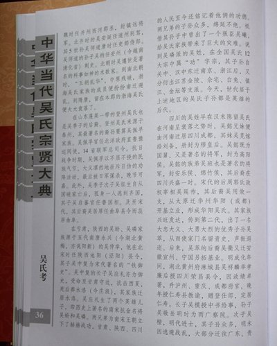 《大典》系吴氏家族史籍。收录范围不受旧的传统观念束缚,既收录吴氏中省军级以上高官名将,又收录造福一方的地方科局级及相当此级职称(均含副职)以上的中层人士;既收录吴氏中名闻遐迩的教授、专家、学者、高级文化科研人员和国营与民营企业家,又收录对国家、社会有一定贡献的族彦乡贤,同为一个目的:彰表贤士,激励后人。