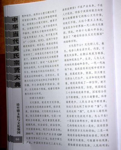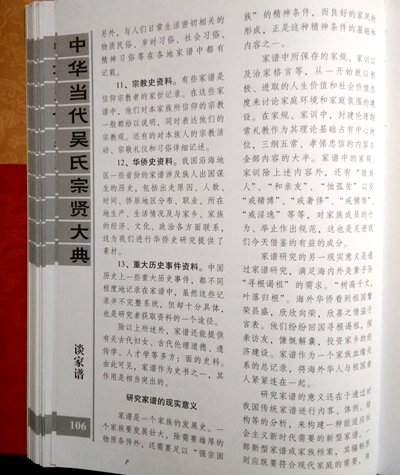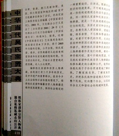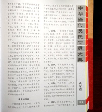 《大典》系吴氏家族史籍。收录范围不受旧的传统观念束缚,既收录吴氏中省军级以上高官名将,又收录造福一方的地方科局级及相当此级职称(均含副职)以上的中层人士;既收录吴氏中名闻遐迩的教授、专家、学者、高级文化科研人员和国营与民营企业家,又收录对国家、社会有一定贡献的族彦乡贤,同为一个目的:彰表贤士,激励后人。
