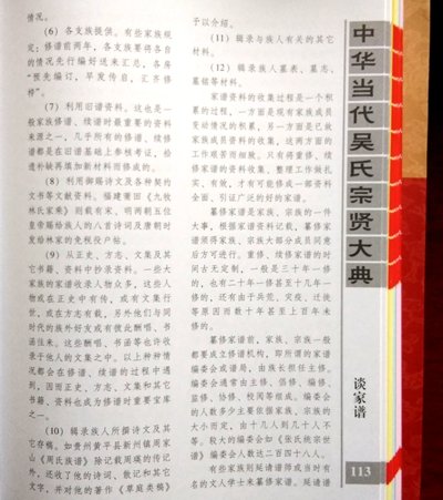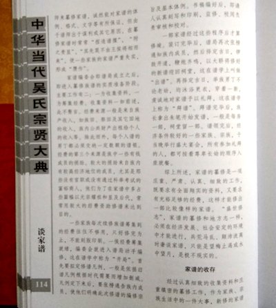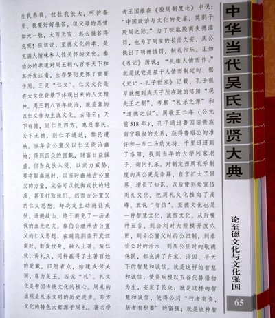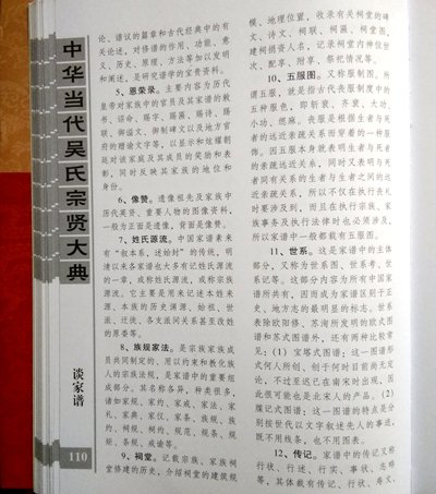 《大典》系吴氏家族史籍。收录范围不受旧的传统观念束缚,既收录吴氏中省军级以上高官名将,又收录造福一方的地方科局级及相当此级职称(均含副职)以上的中层人士;既收录吴氏中名闻遐迩的教授、专家、学者、高级文化科研人员和国营与民营企业家,又收录对国家、社会有一定贡献的族彦乡贤,同为一个目的:彰表贤士,激励后人。