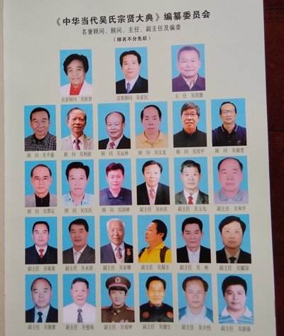 本《大典》名誉顾问:吴桂贤(原中共中央政治局候补委员、国务院副总理),首席顾问:吴希民(博士、世界至德宗亲总会主席),编委会主任、主编:吴洪激(教授、史学家、新闻出版编审、世界至德宗亲总会常务副主席),编委会副主任、副主编共计63名参与编纂。