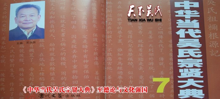 据《中华当代吴氏宗贤大典》主编吴洪激介绍,期待已久的《中华当代吴氏宗贤大典》第七卷已正式由当代文艺出版社于2018年4月第一版出版,该书共385页,内容丰富,图文并茂。 《中华当代吴氏宗贤大典》(以下简称《大典》),自2002年以来,陆续编辑出版了7卷,收录了政治军事界、新闻教育界、科学技术界、医药卫生界和各地族彦乡贤等3810人。已被国家图书馆、档案馆收藏,传诸后世。大典弥补了宗谱之不足,在海内外影响很大。