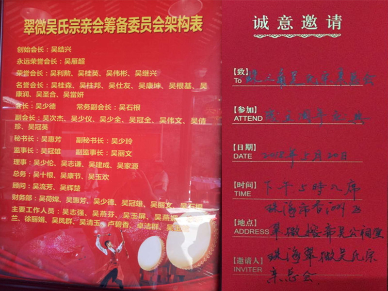 珠海翠微吴氏宗亲总会成立一周年庆典在珠海市香洲区翠微榕斋吴公祠堂举行,参加这次一周年庆典的吴氏宗亲会代表及吴氏宗亲共有500多名。下午六点多,庆典活动正式开始,庆典活动议程有:一是珠海翠微吴氏宗亲总会领导在翠微榕斋吴公祠向祖先拜祭。二是对当选为珠海翠微吴氏宗亲总会创始会长、永远荣誉会长、荣誉会长、名誉会长、会长、常务副会长、副会长、秘书长、副秘书长、监事长、理事、顾问进行颁发当选证书。三是宣读捐款的吴氏宗亲,广东珠三角吴氏宗亲总会常务副会长吴占标捐款1000元给翠微榕斋吴公祠。四是,晚宴期间,除了每台每位宗亲都有奖品外,翠微吴氏宗亲总会还举行了现场抽奖活动,现场抽奖礼品有现金、有实物,丰富多彩。