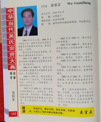 【吴官正简介】出生年月:1938年8月,祖籍:江西余干,现在住址:北京中纪委,职务:原中共中央政治局常委、中纪委书记。