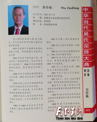【吴作栋简介】出生年月:1941年5月,祖籍:福建省永春县湖洋镇吴岭村,现在住址:新加坡,职务:新加坡前总理,系入闽始祖吴祭公第33代裔孙,其父吴佳昆8岁时随父漂洋过海到新加坡。