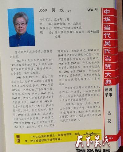 【吴仪简介】出生年月:1938年11月,祖籍:湖北黄梅,出生武汉市,现在住址:中华人民共和国国务院,职务:原中共中央政治局委员、国务院副总理,原中共中央政局委员、国务院副总理。