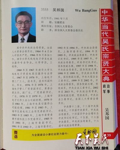 【吴邦国简介】出生年月:1941年7月,祖籍:安徽肥东,现在住址:全国人大常委会,职务:原全国人大常委会委员长,原中共中央政治局常委,全国人大常委会委员长。