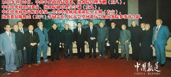 1992年1月20日,中共中央政治局常委、国务院总理李鹏(左八),中共中央政治局委员、国务院副总理吴学谦(左九),中共中央政治局候补委员、中共中央统战部部长丁关根(右六),国务委员陈俊生(左六)等同志在人民大会堂河北厅会见国务院参事并合影。