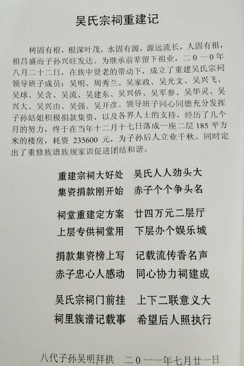 雷州歌:“吴氏文化研究会,领导带头来慰问;关心宗亲个生活,共建和谐靓家园。宗亲成立研究会,组织有紊大发展;困难相帮为宗旨,感恩不忘有作为。宗亲兄弟问不悔,共建平台显神威;不图回报不谋利,奉献精神美十全。成员人人眼光远,亲情不讳嫌麻烦;发扬美德多援助,帮了难者多少回。歌颂吴氏研究会,感恩上门问寒酸;不辞劳苦助人乐,初心不忘咱吴门。根深叶茂枝劲美,源远流长意去追;泰伯子孙虽居散,有心追寻找回全”(吴明宗长特为吴氏宗亲和安行而作)