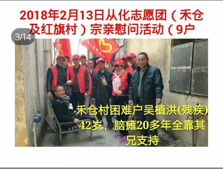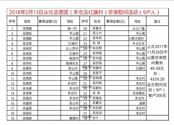 据悉,从化吴氏宗亲志愿团在2017年5月29曰由一群志同道合,充满爱心,正能量的吴氏兄弟组成。是一个家族性公益团体,无偿为吴氏家族服务,奉献爱心,传递温暖,在过去的一年里慰问了二十几户特困,残疾,高龄,孤家寡老人,得到了大家的认可。相信曰后有你们的支持和参与会做得更好,一人力薄,众志成城,赠人玫瑰手有余香,帮助别人也是帮助自己。