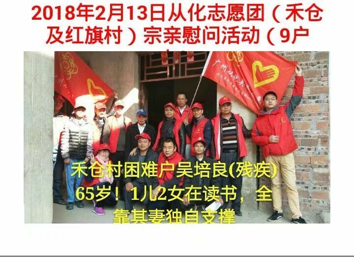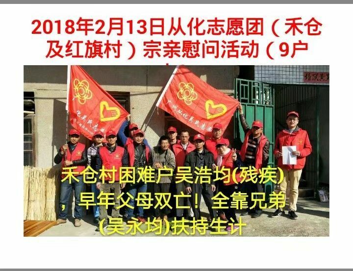 据悉,从化吴氏宗亲志愿团在2017年5月29曰由一群志同道合,充满爱心,正能量的吴氏兄弟组成。是一个家族性公益团体,无偿为吴氏家族服务,奉献爱心,传递温暖,在过去的一年里慰问了二十几户特困,残疾,高龄,孤家寡老人,得到了大家的认可。相信曰后有你们的支持和参与会做得更好,一人力薄,众志成城,赠人玫瑰手有余香,帮助别人也是帮助自己。