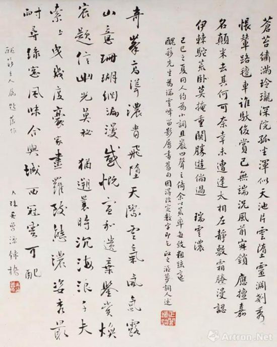 1. 苍苔繍满 , 玲珑深院孤坐。浑似天池片云堕。灵渊刬秀,怅辇路、 氊车谁驮。后赏已无端,况风前寐锁。应擅嘉名,颠米去、其何可奈。 幸未遭逢太相左。静敷霜黛,漫认伊、棘驼荒卧。莫掩重阙,胜游倘过。 瑞云浓。 己巳之夏同人约为小词且严四声之倚,余以荒率每致粗疏,适丑移先生为瑞云峰留影属书旧句 因得改定数字即乞政之,沤梦词人述。钤印: 正闇填词