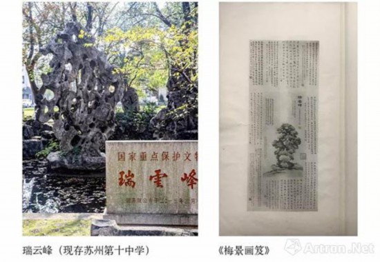 太湖石“瑞云峰”最早出自太湖西山岛东侧一小岛,原是岛上的一座小石峰,与另一座稍大些的并称为“大、小谢姑”。北宋崇宁四年(1105年),苏州设立应奉局,佞臣朱勔在江浙搜集奇花异石,进贡于宋徽宗的汴京御园。经过精心挑选,朱勔拟将大、小谢姑两峰湖石并运至汴京。大谢姑顺利成行,被安置在御苑根岳,命名为“昭功神运石”,封为“盘固侯”。“小谢姑”未及起运,被留于太湖,成宋徽宗“花石纲”的遗物。直到明代弘治年间,小谢姑被苏州进士陈霁看中,将其运回置放于厅堂之前。明末徐树丕《识小录》中记载:陈霁“堂前有峰石五座,其最巨者日‘瑞云’,层灵迭秀,挺拔云际,诚巨观也”。后陈家日渐衰落几经易手,嘉靖年间由浙江乌程富贵望族董份购得,不久董氏与万历年进士太仆寺少卿徐泰时联姻,徐氏爱石,董氏遂此石作为女儿陪嫁相赠,运至徐氏在苏州的私邸东园(今留园)安置。徐泰时去世后,其子徐清之花费“三百金”终于将石峰竖立起来。到乾隆四十四年(1779年),时值清高宗南巡,驻跸苏州府织造署,织造太监为取悦乾隆帝,便将此石辗转迁至织造署西行宫的西花园内水池中供置(今为苏州的第十中学),瑞云峰正面朝北,对着皇帝的寝宫。咸丰十年(1860年),织造署毁于兵燹。同治十年(1871年),曾国藩等人主持重建织造署[19]。辛亥革命后,织造署建筑再次遭到破坏。虽经多次劫难,但瑞云峰仍孑然独立。1928年,振华女校迁入原织造署。文革时原织造署大门前的一对石狮遭红卫兵烈火焚烧、冷水浇泼而严重受损,但瑞云峰竟然奇迹般地又逃过一劫。今瑞云峰伫立于苏州第十中学西花园水池内,位居“江南三大名石”之首。民国元老李根源誉为“苏城三绝”(另二绝为拙政园内文征明手植的紫藤与西园寺所藏的“继善血经”),被列为省级文物保护单位。